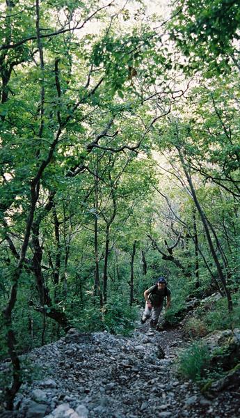 Anna kämpar på uppför. Skönt med lite träd omkring som ger fuktig svalka men framförallt är de bra att ha som handtag när det är brant och ojämnt underlag.
