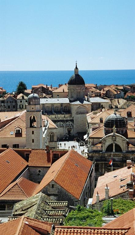 Byggnaderna har olika karaktär. I bortre änden av torget syns katedralen. Till höger om torget ses St Blaise's kyrka. Till vänster syns klocktornet vid Lua-torget.