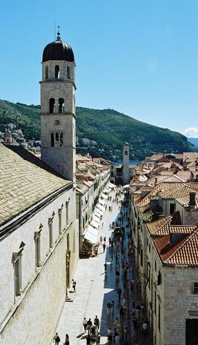 Gågatan Placa där turisterna flanerar och shoppar i butikerna. Franciskanerklostrets kyrka är mycket vacker inuti.