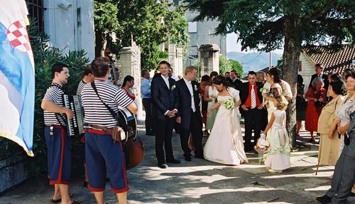Bröllopsföljet har samlats utanför kyrkan.