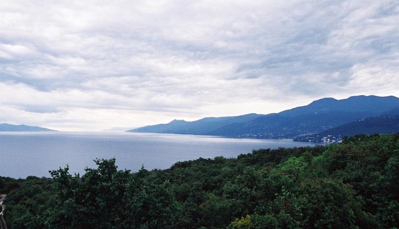 Utsikt över Rijecki zaljev med Istria till höger och rakt fram i bild. Bild tagen från nära Rijeka.