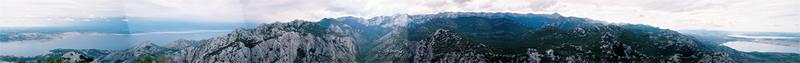 Ungefär 360 graders panoramavy från toppen av Anica kuk. Vattnet till vänster är Velebitski kanal, i centrum av bilden är dalgången från föregående bild.