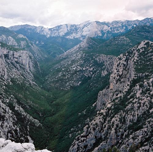 Utsikt från toppen ner i dalgången Velika Paklenica.