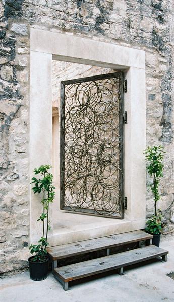 Elegant och annorlunda utformad gallerdörr till ett museum. Den består av sammansvetsade metalltrådar formade i ett virrvarr.