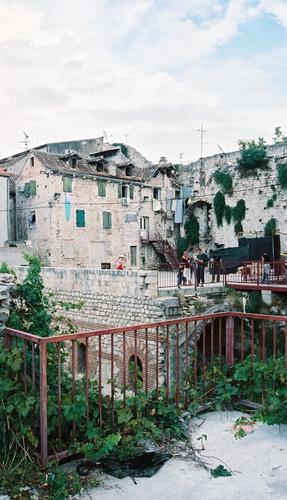 Det finns folk som bor i hus inne i palatset, och på det svarta paraplyet på marken ligger en liten kolsvart kattunge och ser både söt och lömsk ut.