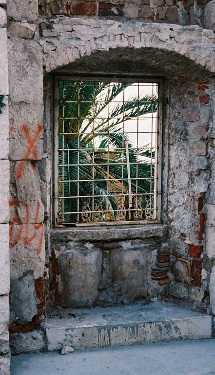 Yttermur sedd från insidan. Det syns gamla pelare, och min gissning är att muren har tätats med tegelstenar under årens lopp.