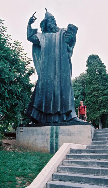 Gigantisk staty föreställande biskop Grgur Ninski utanför Golden gate.