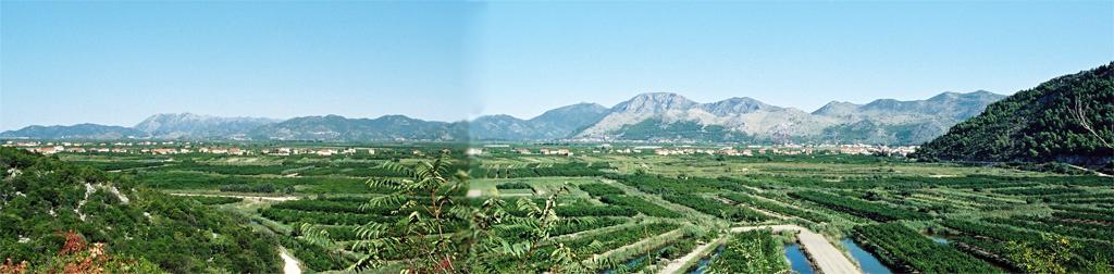 | Vy över floden Neretvas deltaområde. Det liknar Nederländerna och det odlas frukt överallt. Neretva rinner från Bosnien ut i Adriatiska havet. Metkovic´ ligger invid den, liksom staden Mostar i Bosnien (känd för sin i kriget sönderbombade bro). |