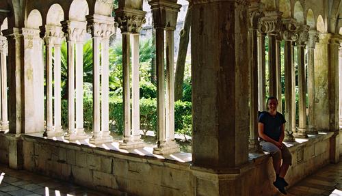 Anna vilar benen inne på klostergården. Denna pelargång är från mitten av 1300-talet och varje pelarkrön är unikt i sin utformning.