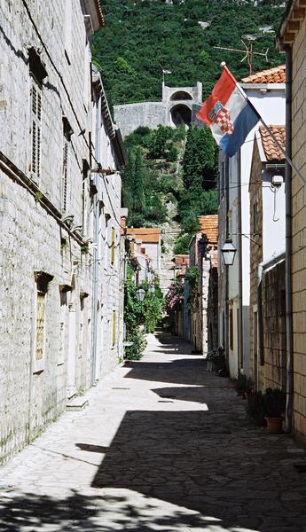 Gata i Ston. Den kroatiska flaggan vajar stolt.