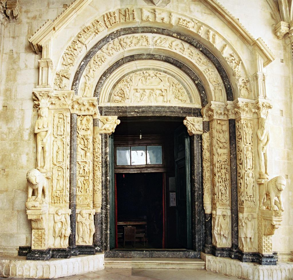 Porten in till katedral St Lovro är mycket rikt utsmyckad. Notera samhällsstegen med slavar i botten. Adam och Eva och venetianska lejon finns också med.